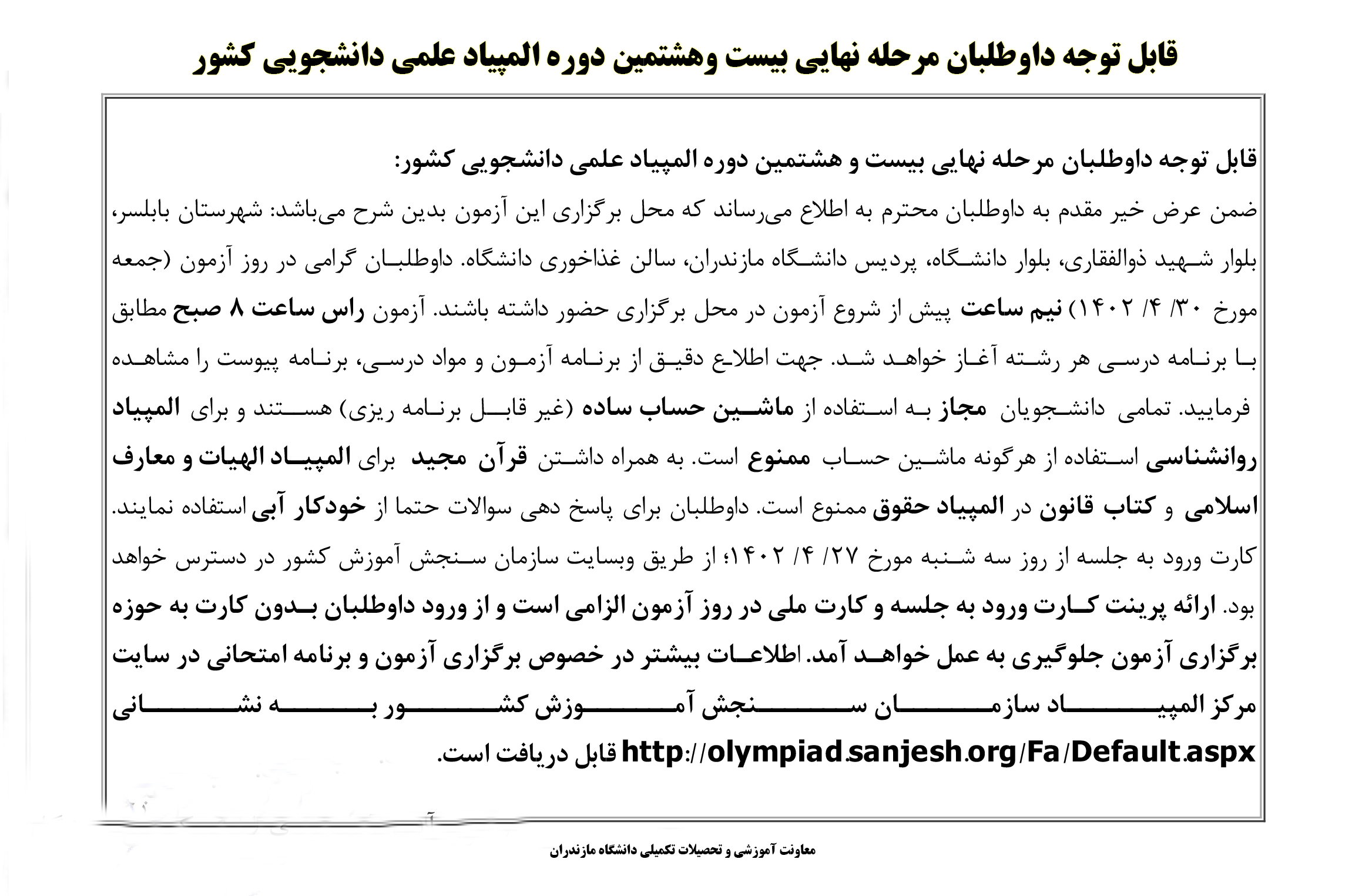 برنامه آزمون مرحله نهایی بیست وهشتمین دوره المپیاد علمی دانشجویی کشور - دانشگاه مازندران