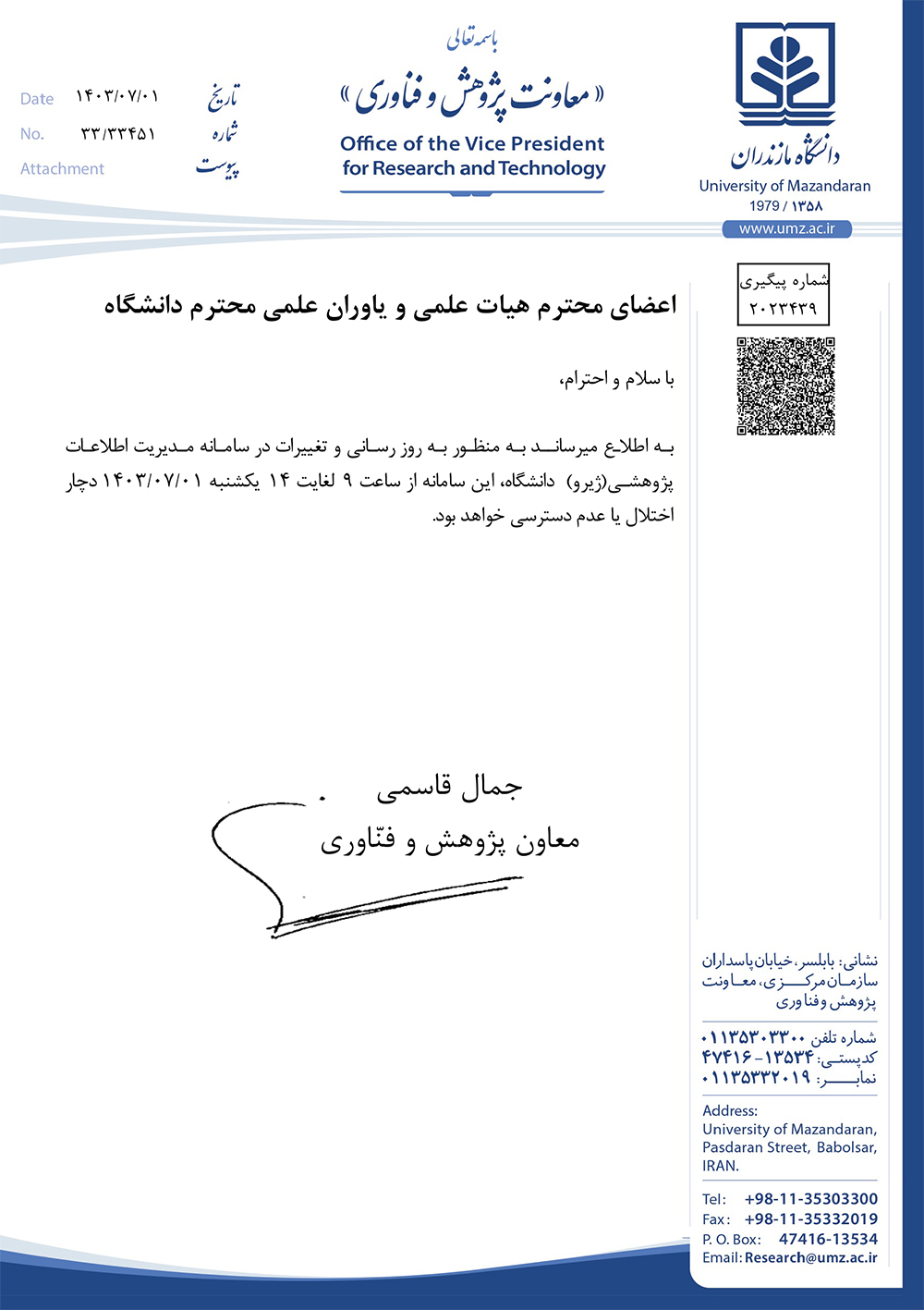 بهروزرسانی و تغییرات در سامانه مدیریت اطلاعات پژوهشی(ژیرو) دانشگاه - دانشگاه مازندران