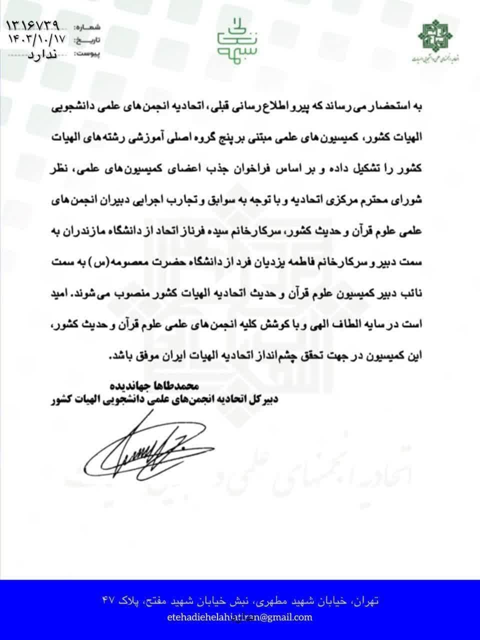 بر اساس این گزارش، پیرو اطلاعرسانی قبلی اتحادیه انجمنهای علمی دانشجویی الهیات کشور، کمیسیونهای علمی مبتنی بر پنج گروه اصلی آموزشی رشتههای الهیات تشکیل شد و با توجه به فراخوان جذب اعضای کمیسیونهای علمی، نظر شورای مرکزی اتحادیه و با عنایت به سوابق و تجارب اجرایی دبیران انجمنهای علمی علوم قرآن و حدیث کشور، سیده فرناز اتحاد از دانشگاه مازندران به سمت دبیر و فاطمه یزدیان فرد از دانشگاه حضرت معصومه(س) به سمت نایب دبیر کمیسیون علوم قرآن و حديث اتحاديه الهيات كشور منصوب شدند.