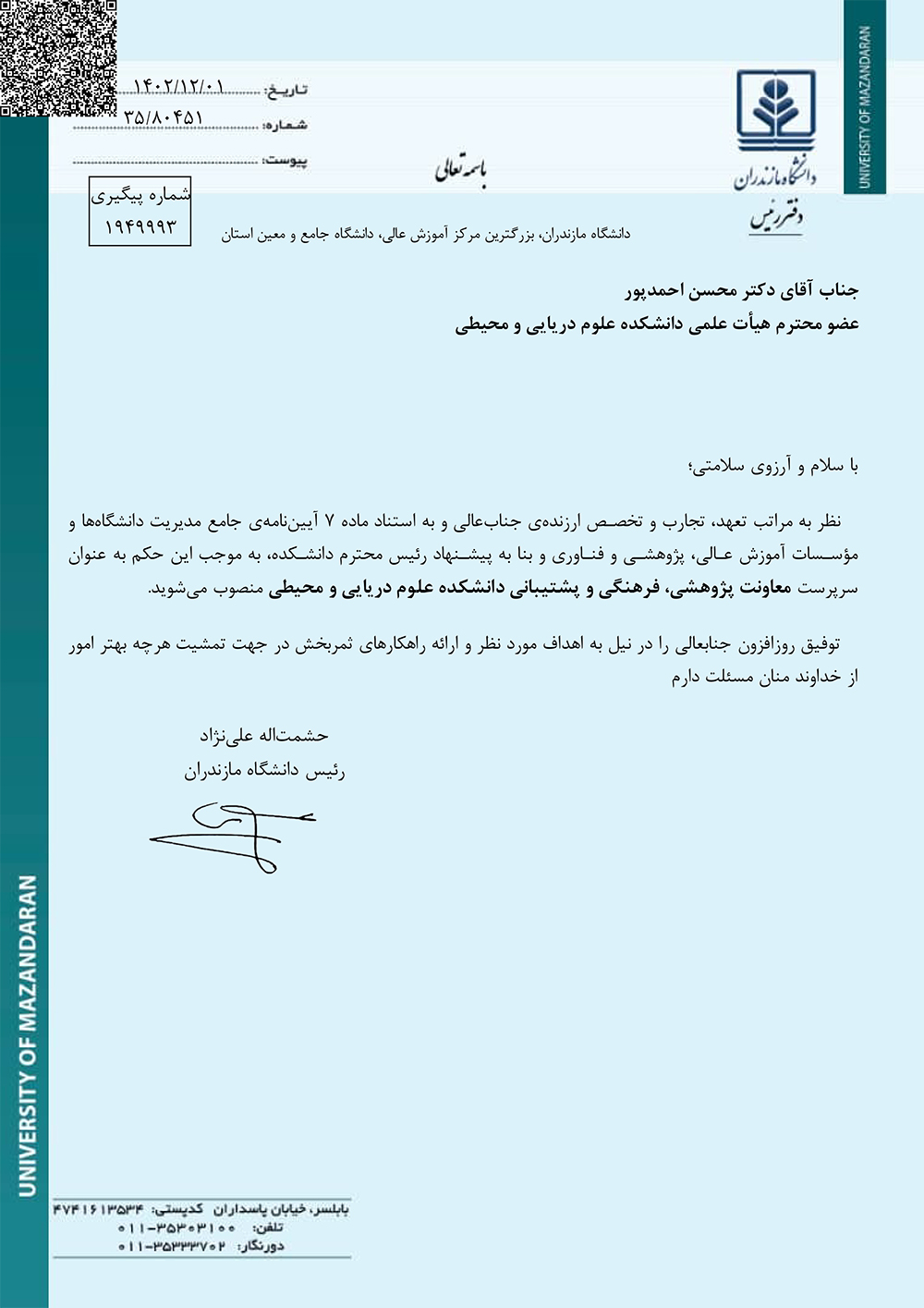 سرپرست معاونت پژوهشی، فرهنگی و پشتیبانی دانشکده علوم دریایی و محیطی دانشگاه مازندران منصوب شد - دانشگاه مازندران