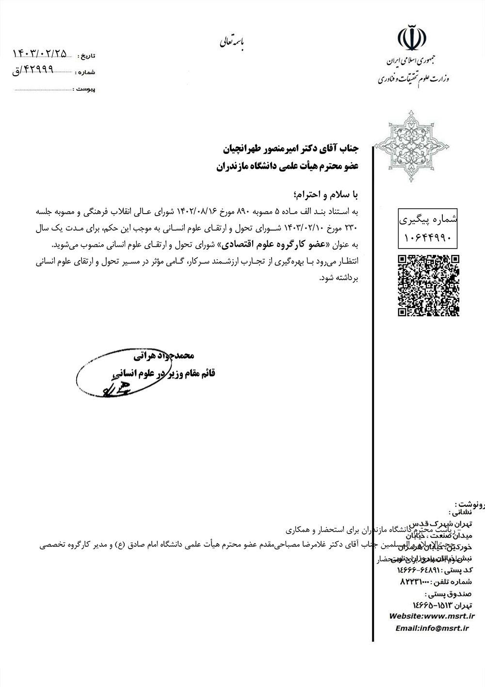 عضو هیات علمی دانشگاه مازندران به عنوان عضو کارگروه علوم اقتصادی وزارت عتف منصوب شد