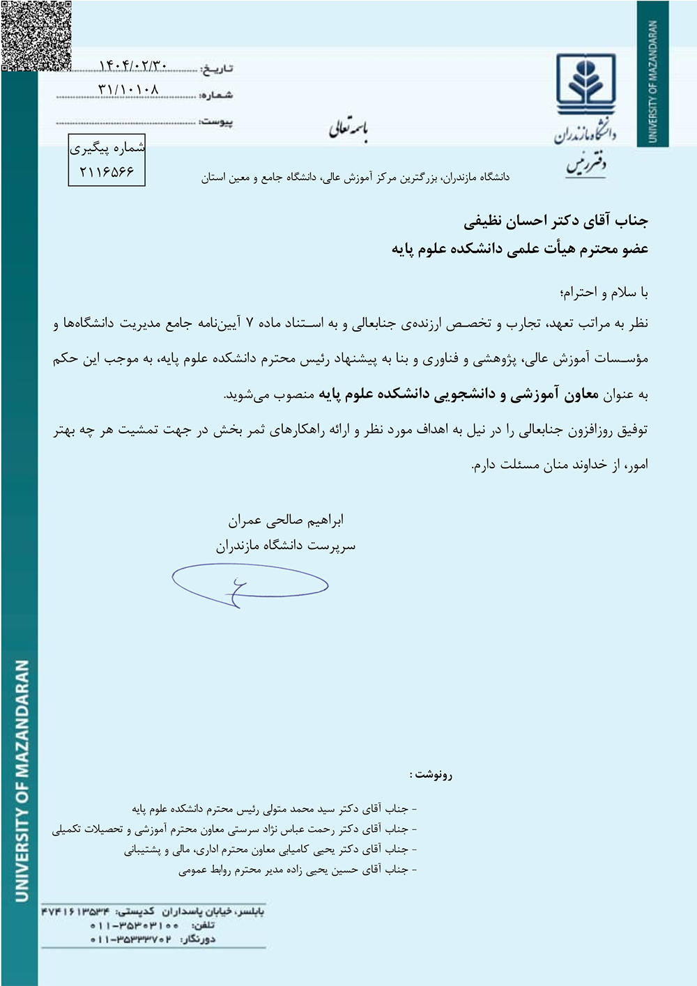 معاون آموزشی و دانشجویی دانشکده علوم پایه دانشگاه مازندران منصوب شد